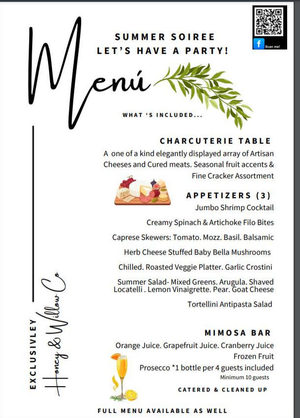 The Summer Soirée hosted by Honey & Willow Co. was nothing short of amazing! From the beautifully curated charcuterie table overflowing with artisan cheeses, cured meats, and fresh seasonal fruits to the elegant appetizer spread, every detail was perfectly executed.The Jumbo Shrimp Cocktail was a crowd favorite, while the Creamy Spinach & Artichoke Filo Bites and Caprese Skewers were both delicious and artfully presented. The Mimosa Bar was a fun, refreshing touch — the perfect way to toast to summer with a mix of fresh juices and prosecco.Everything was tastefully arranged, catered, and cleaned up seamlessly, allowing guests to simply relax and enjoy the evening. You could truly feel the care and creativity that went into every element.If you’re looking for an event that combines elegance, flavor, and effortless enjoyment — this is it.