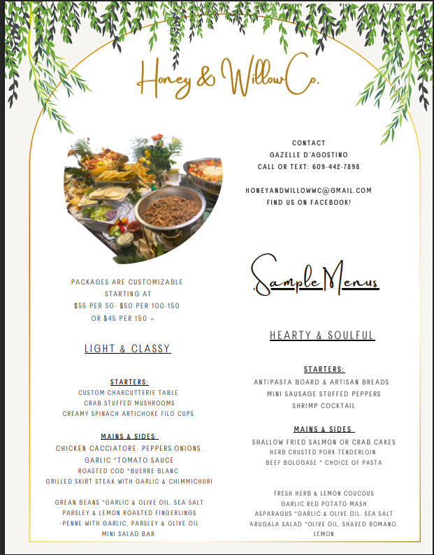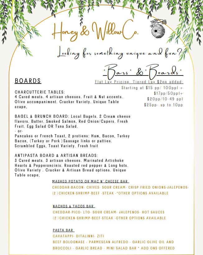 We recently hosted a 100-person baby Shower catered by Honey & Willow Co., and they absolutely delivered. The slider bar was a huge crowd-pleaser — everyone loved being able to mix and match different toppings and sauces. The charcuterie table looked incredible and was constantly surrounded by guests, and the caprese skewers added such a fresh, elegant touch.Everything was beautifully displayed and tasted amazing without feeling overdone. The team was professional, friendly, and kept everything running smoothly from start to finish.It can be hard to feed a big group and still keep things special, but Honey & Willow Co. pulled it off perfectly. We got so many compliments on the food and presentation. Highly recommend them for any large event!